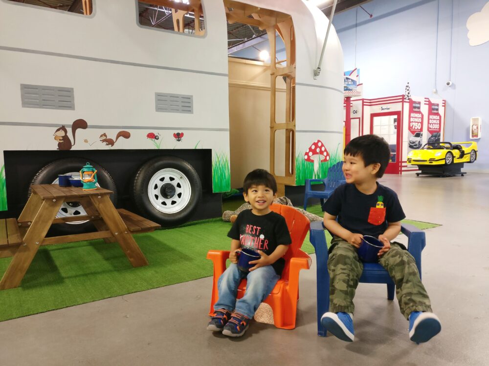 Kidtropolis is hands-down my favourite indoor play space for toddlers. It’s set up as an interactive town complete with a school, restaurant, fire station, theatre, jail, ice cream parlour, newsroom, and many more. Kids can fly a plane, mow the lawn, go camping, be a doctor, fill up at the gas station, buy groceries, visit the vet, clean their home… the list is endless. There are mailboxes throughout the town for kids to deliver and pick up letters, and Little Tikes cars to drive around. The way Kidtropolis sparks kids’ imagination and pretend play is positively magical. The facility also boasts a giant climbing structure that culminates in the best part, the slides, which parents are welcome to enjoy as well! My kids could spend hours here, which is why I appreciated the (real) in-house cafe where we could eat lunch, then return for more play.