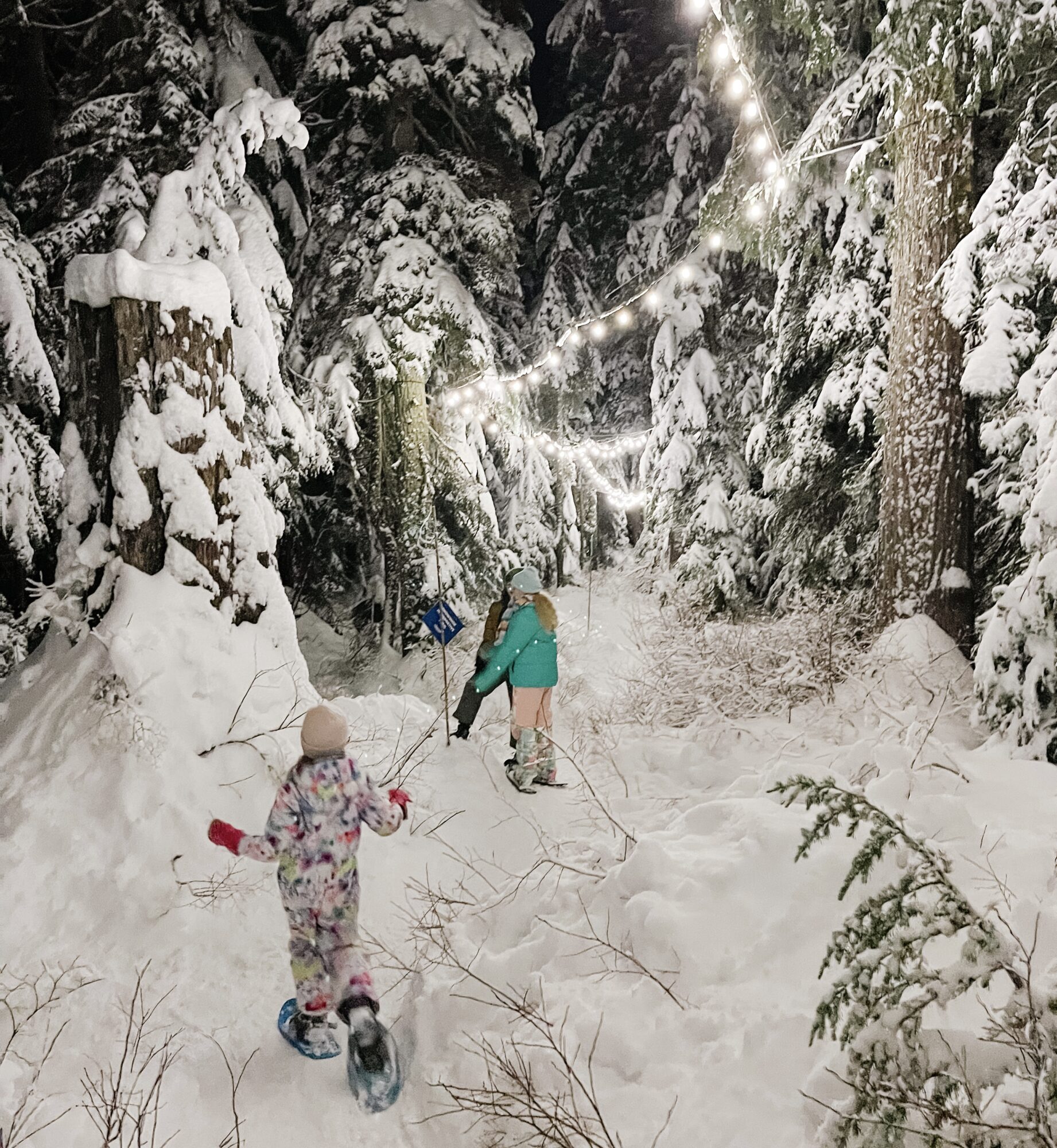 Enjoy the beautiful snowy snowshoe trek to Hollyburn Lodge, only 1.5km along our self guided snowshoe trail! The Light to the Lodge loop is lit with LED lights strung sustainably through the forest boughs of ancient Cedar, Fir and Hemlock trees.